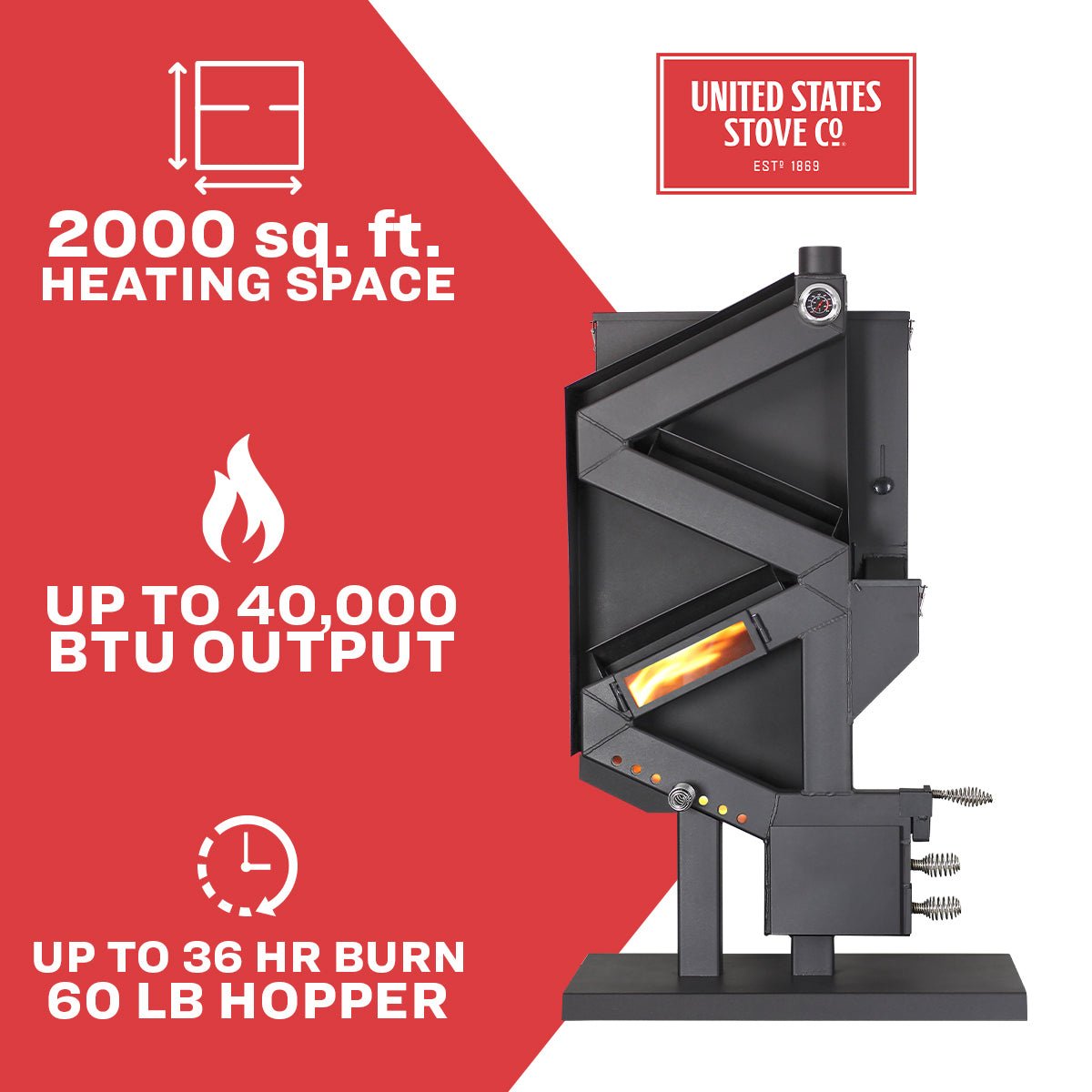 - 60 Lb. hopper for up to 36 hours of heat.